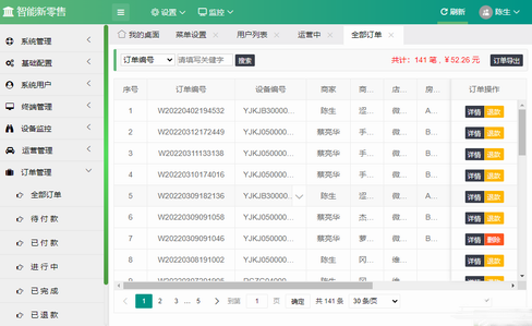 可详细可看系统订单状态、订单相关信息、设备场所、购买用户,退款操作和查看订单分帐信息等(多人分帐)。